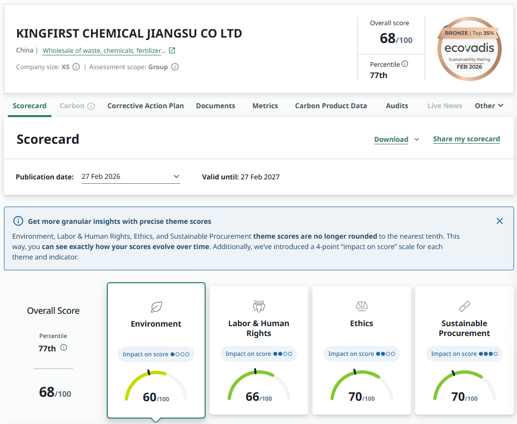 Recently, Kingfirst Chemical scored 68 points in the Ecovadis assessment and was awarded the Bronze Medal for outstanding performance.